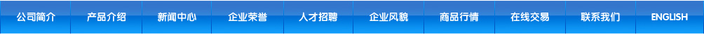 網(wǎng)站首頁(yè) | 公司簡(jiǎn)介 | 產(chǎn)品介紹 | 新聞中心 | 企業(yè)榮譽(yù) | 人才招聘 | 企業(yè)風(fēng)貌 | 商品行情 | 在線交易 | 聯(lián)系我們 | ENGLISH